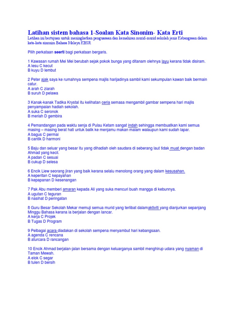 Terikat = terbalut, terbebat, terbelenggu, terbelit, terberkas, terjalin, terkait, terkebat, terkongkong, terkujut, terkurung, terlilit, terpaut, terpikat, tersaur, tersekat, tersimpai, tersimpul, tertambat, tertawan; Pilih perkataan sinonim bagi mengutip. Perkataan 'buli'hanya sinonim untuk ancaman fizikal dan berlaku di kilang. Latihan sinonim 1 (latihan perkataan sama makna) pilih perkataan seerti bagi perkataan bergaris. Sesuatu yg diucapkan (dituturkan), cakap, ujar: